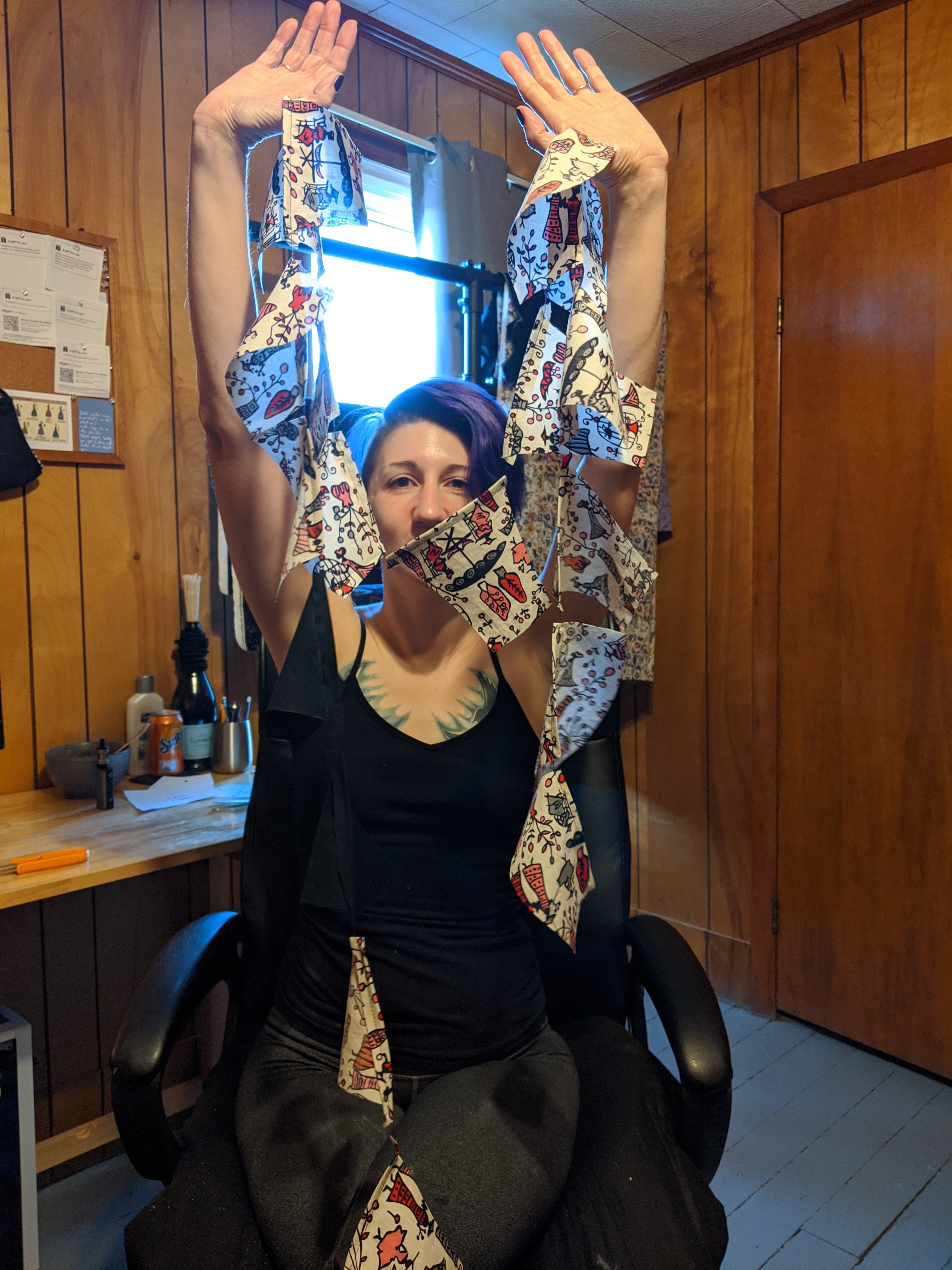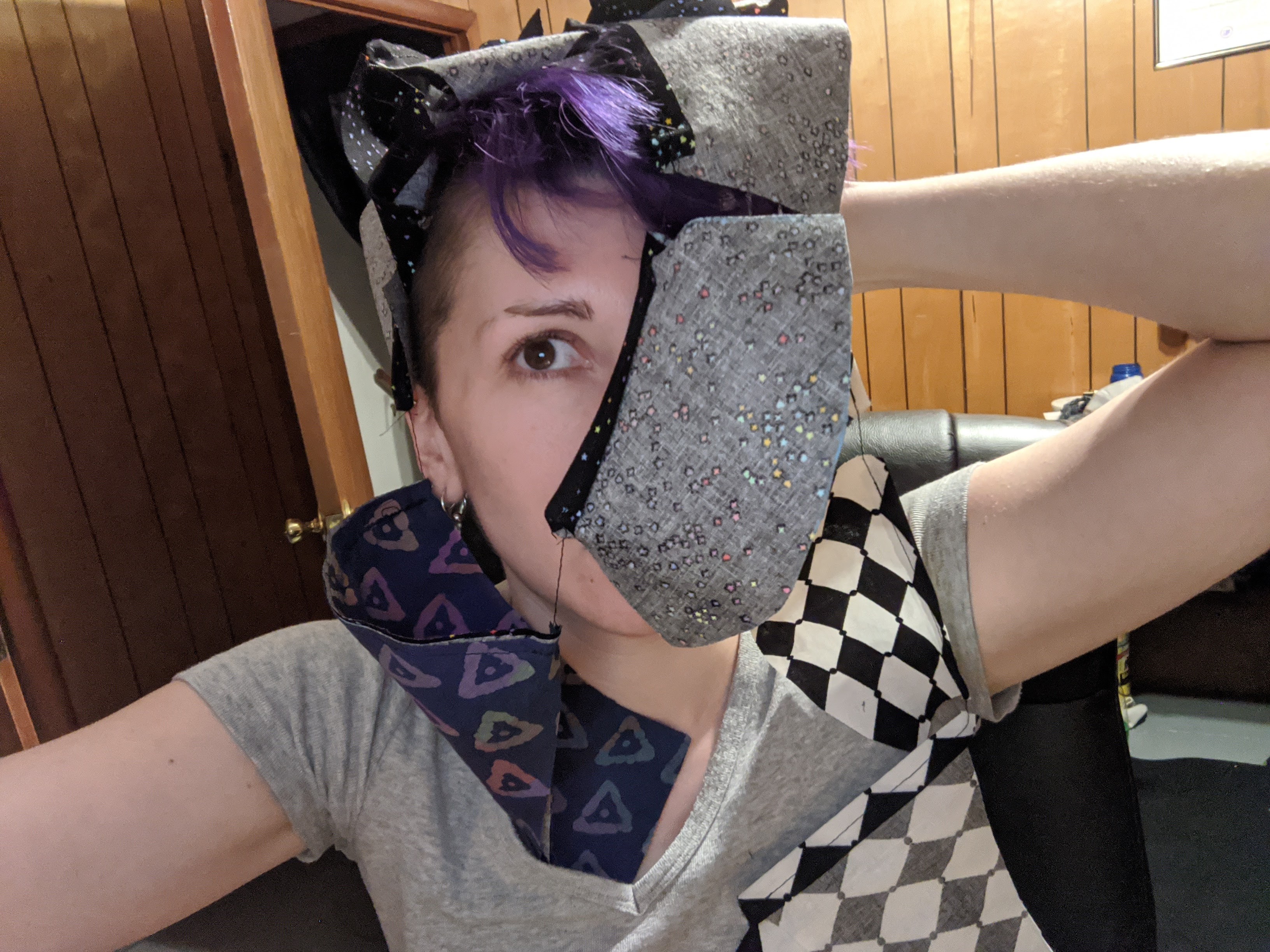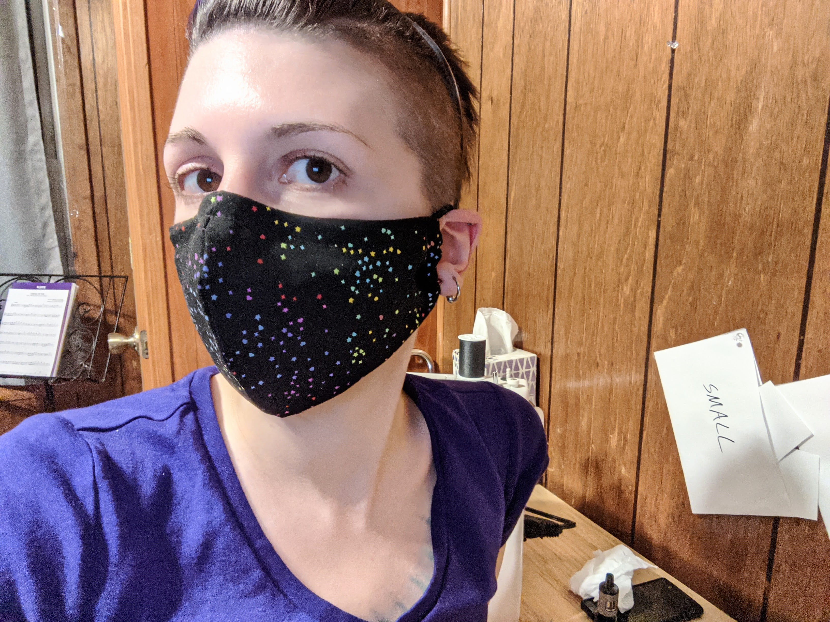 If you need one, you can email masktheplanet@gmail.com with a size (s/m/l) and a masc or femme preference for fabric. I’ll make you one as soon as I can.