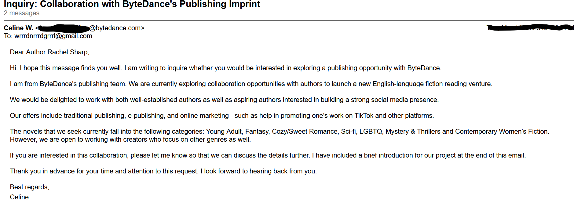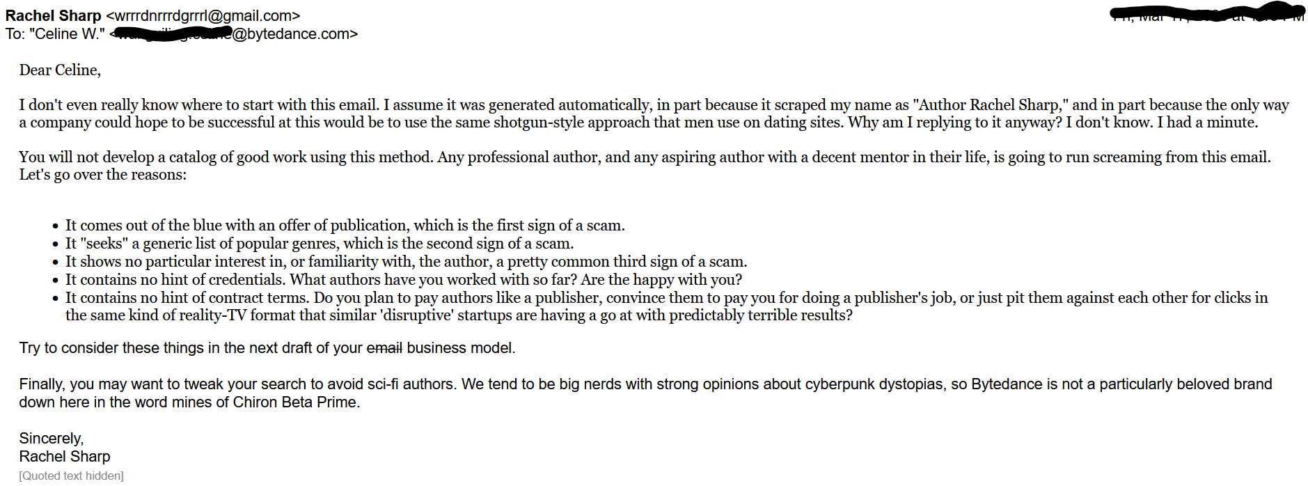 I got an email this week that appears to legitimately be from Bytedance’s “publishing imprint.” Reading it, I wondered how much of it was written by a human. It certainly wasn’t aimed at me by a human, because a human would have taken one glance at my public existence and realized that I was the worst possible target. To be completely honest, I responded to it because I want to see if a human reads the responses, and if so, what their reaction might be. And I’m posting the exchange here because it contains some advice for writers. It might even be a good exercise in spotting red flags. I enumerated a few of them. How many do you see?