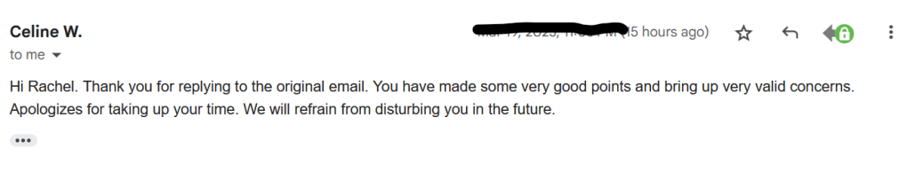 Edit to add: I received a response that I’m fairly confident came from a human. It says my concerns are valid, then makes no attempt to address or defend them. The overall vibe is “Whoops, sorry, wrong number.”